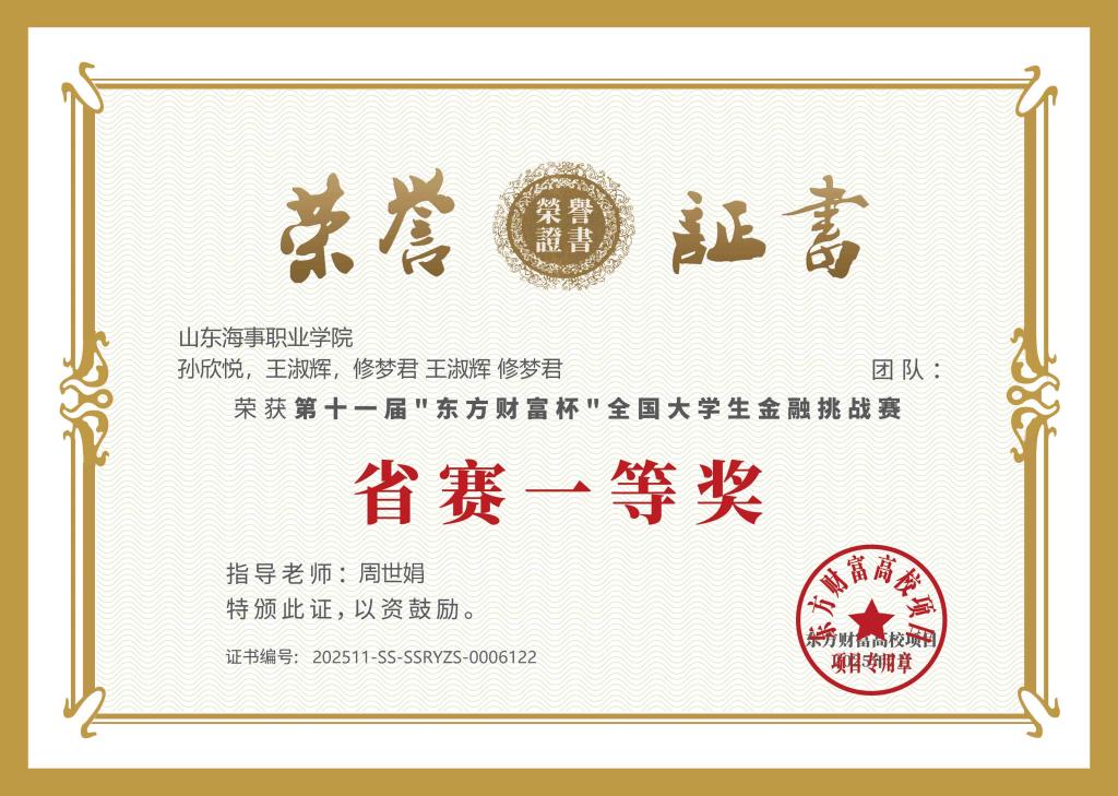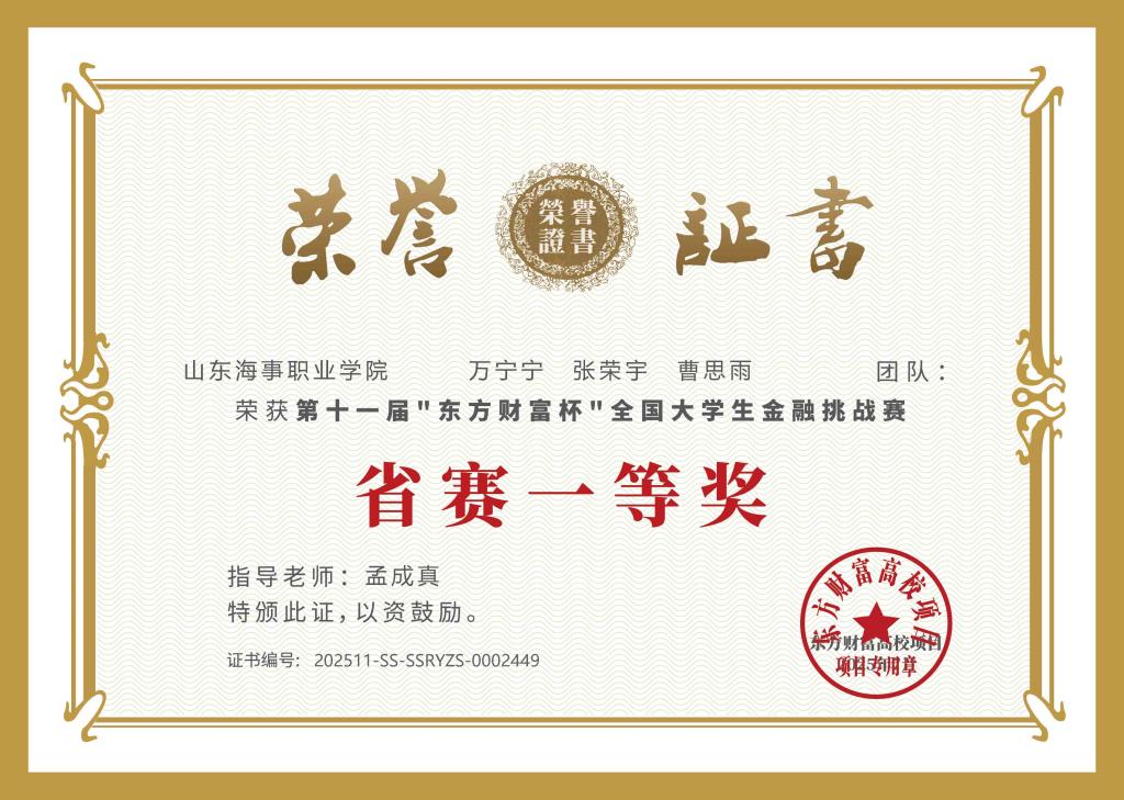 近日,第十一届“东方财富杯”山东省大学生金融挑战赛传来捷报,我院学生在老师的悉心指导下,凭借扎实的金融专业知识和出色的实践能力,积极备战,历经多轮激烈角逐,最终脱颖而出,斩获省一等奖1项、二等奖1项、三等奖4项,展现了我校学生在金融领域的潜力与风采。